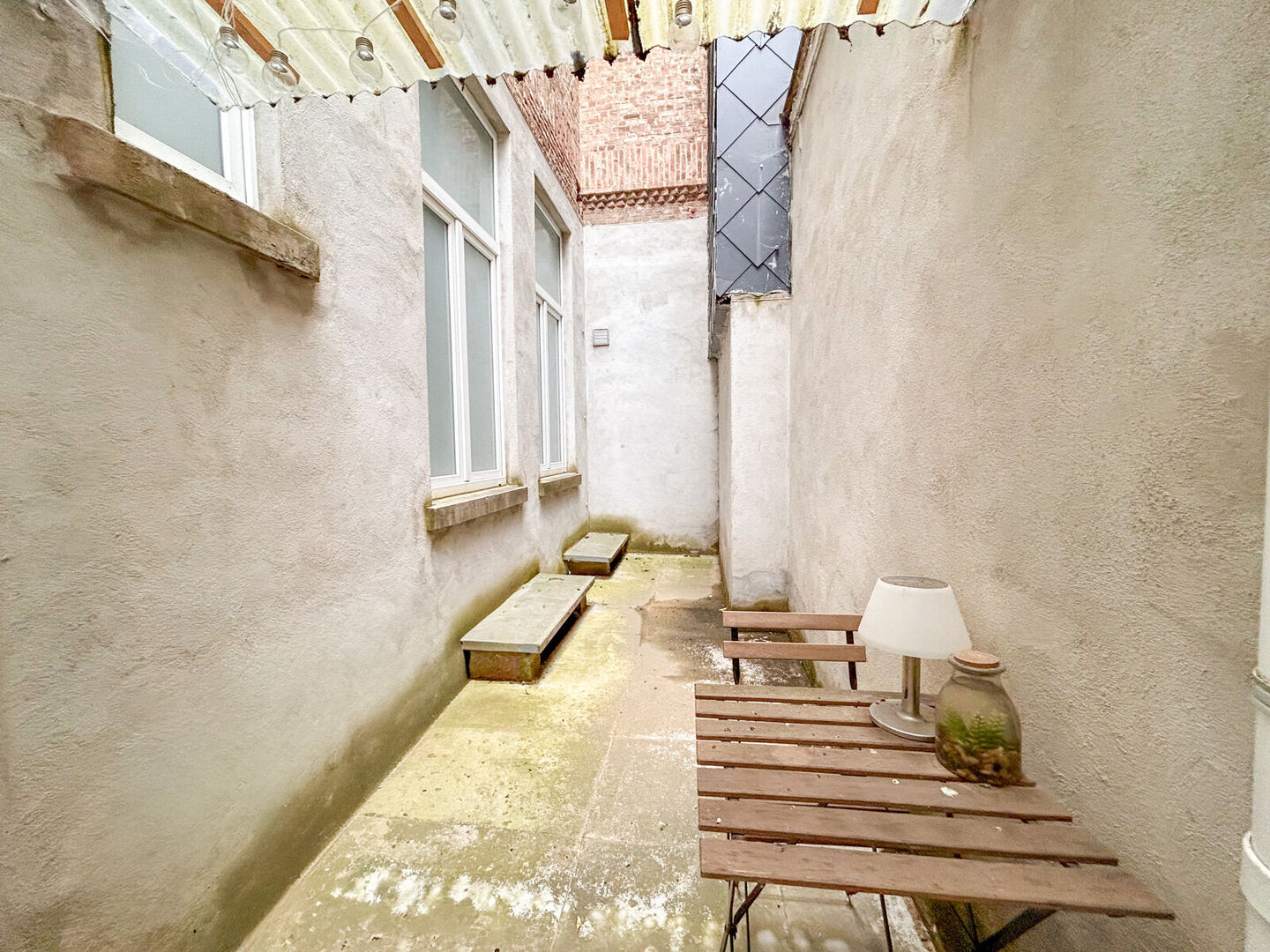 Het appartement is gelegen op de gelijkvloerse verdieping en is voorzien van een ruime, lichtrijke leefruimte en een gedeeltelijk geïnstalleerde keuken (kookplaat, koelkast, combi micro/oven , dampkap), afzonderlijke slaapkamer en badkamer met douche, lavabomeubel en toilet. Buiten is er nog een gezellige koer aanwezig. In de kelder is er nog een privatieve berging met aansluiting voor een wasmachine.