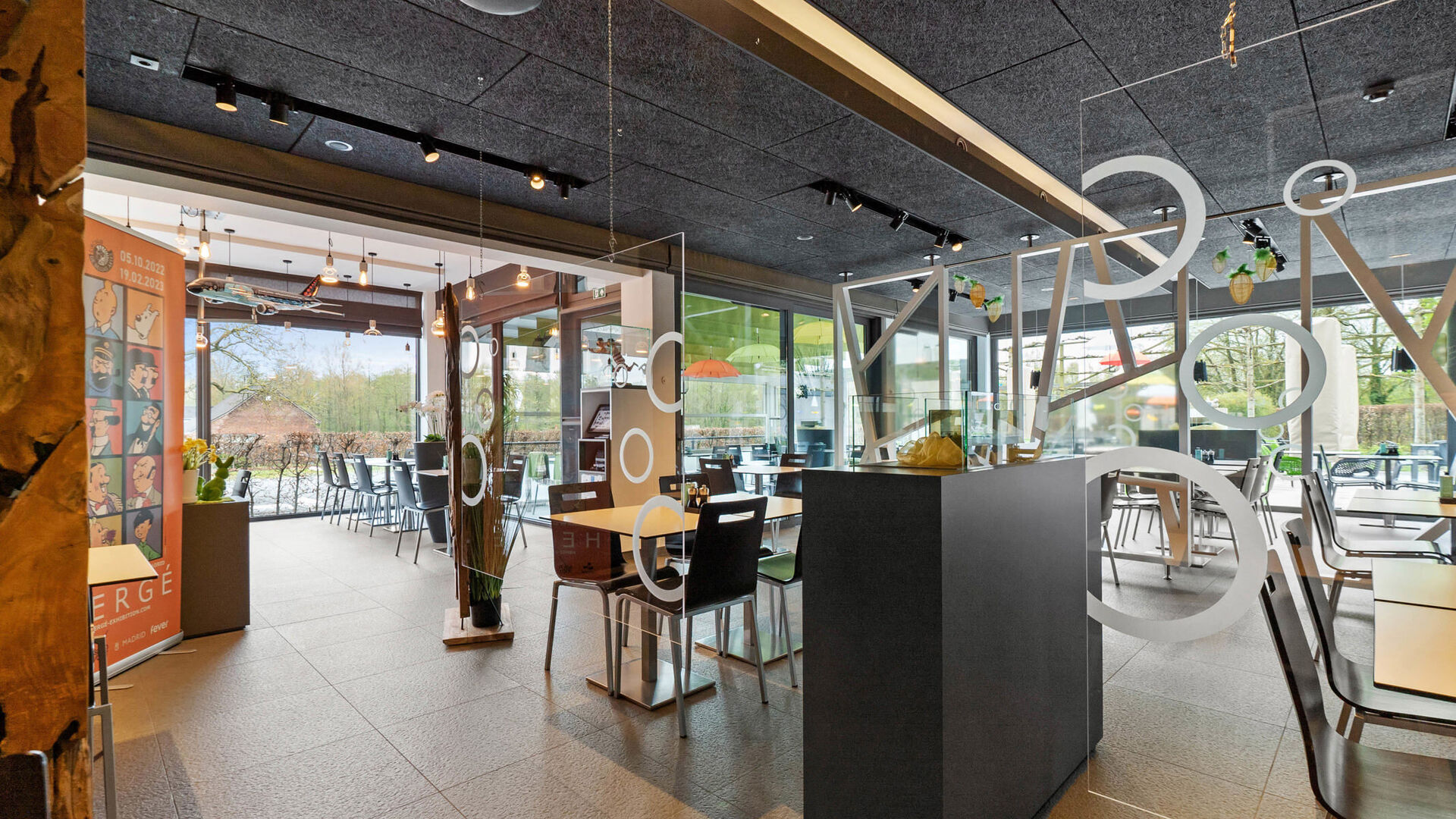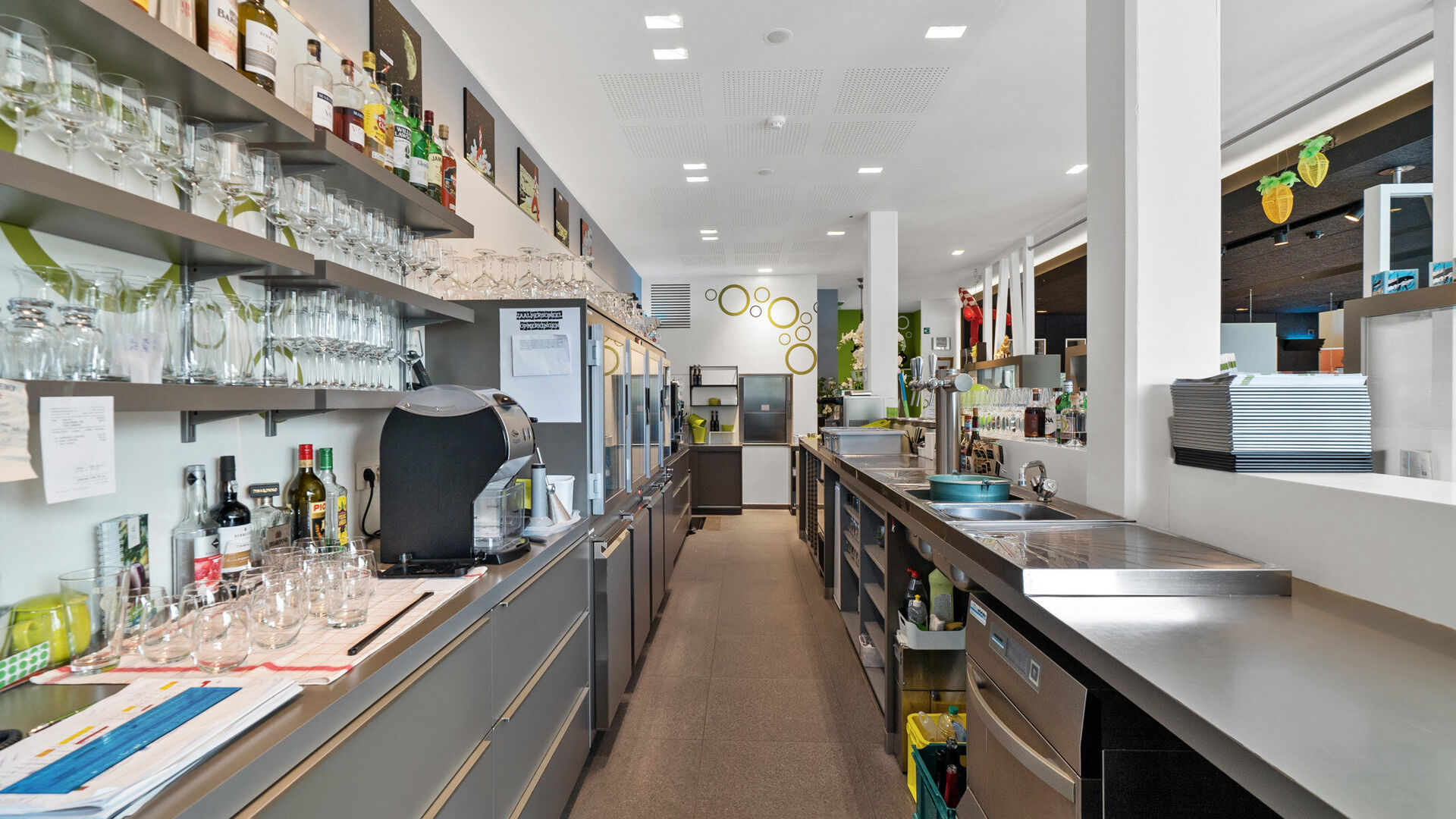 Gelijkvloers: inkom, ruime en lichtrijke zaal (70 couverts) met zicht op het terras, stijlvolle bar en een sanitair blok met 4 toiletten. Buiten is het heerlijk genieten op het terras met vijver. De professionele keuken op de eerste verdieping levert gerechten via een handige lift direct naar de bar.