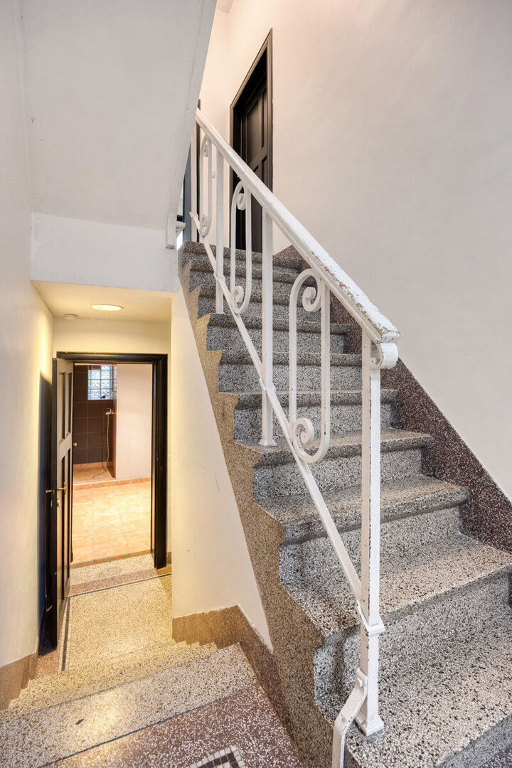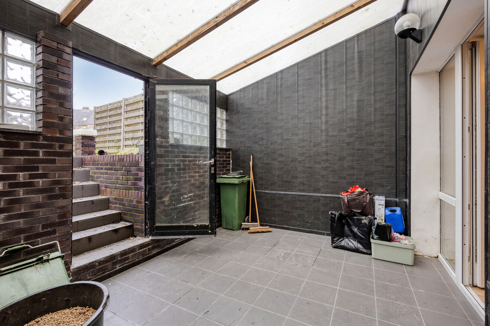 Vervolgens beschikt de woning over een "kelderverdieping/tussenverdieping". Deze verdieping bevindt zich vooraan iets lager dan het straatniveau en achteraan gelijk met de tuin. Het betreft een volwaardige bewoonbare verdieping en bezit een berging/wasplaats, douche, slaapkamer/bureau en een veranda.