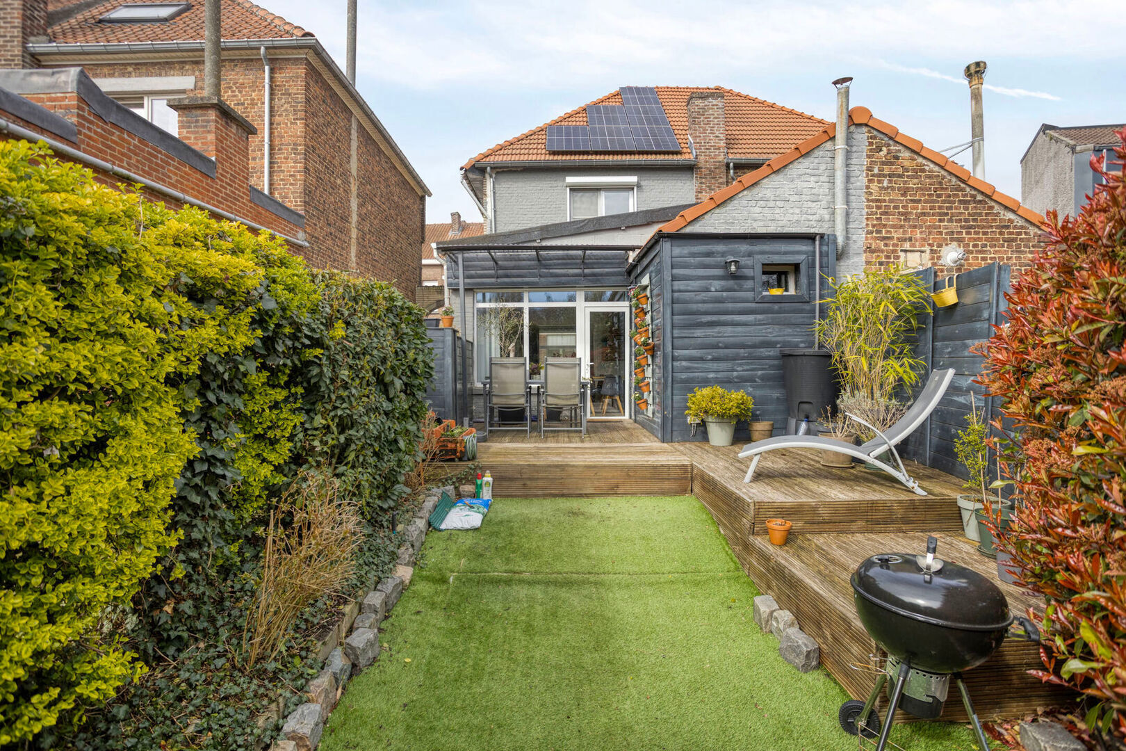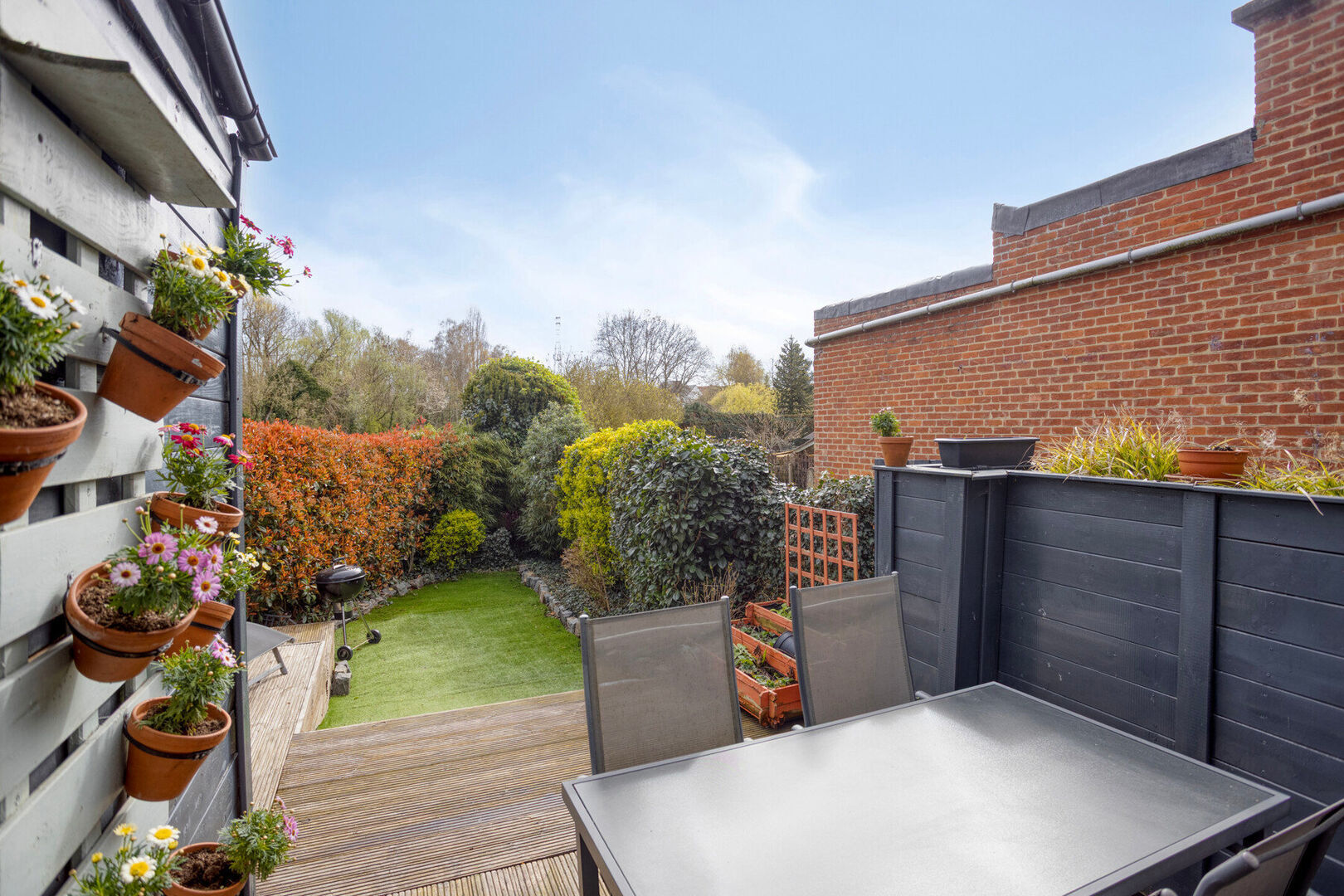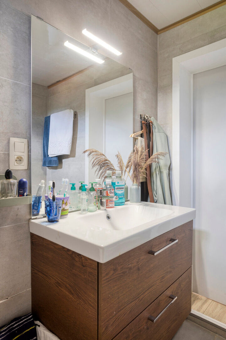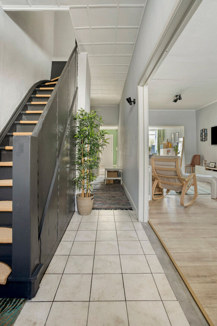 Buiten geniet u van een aangenaam terras en een achterliggende tuin die bereikbaar is via een erfdienstbaarheid, ideaal om in alle rust te ontspannen.