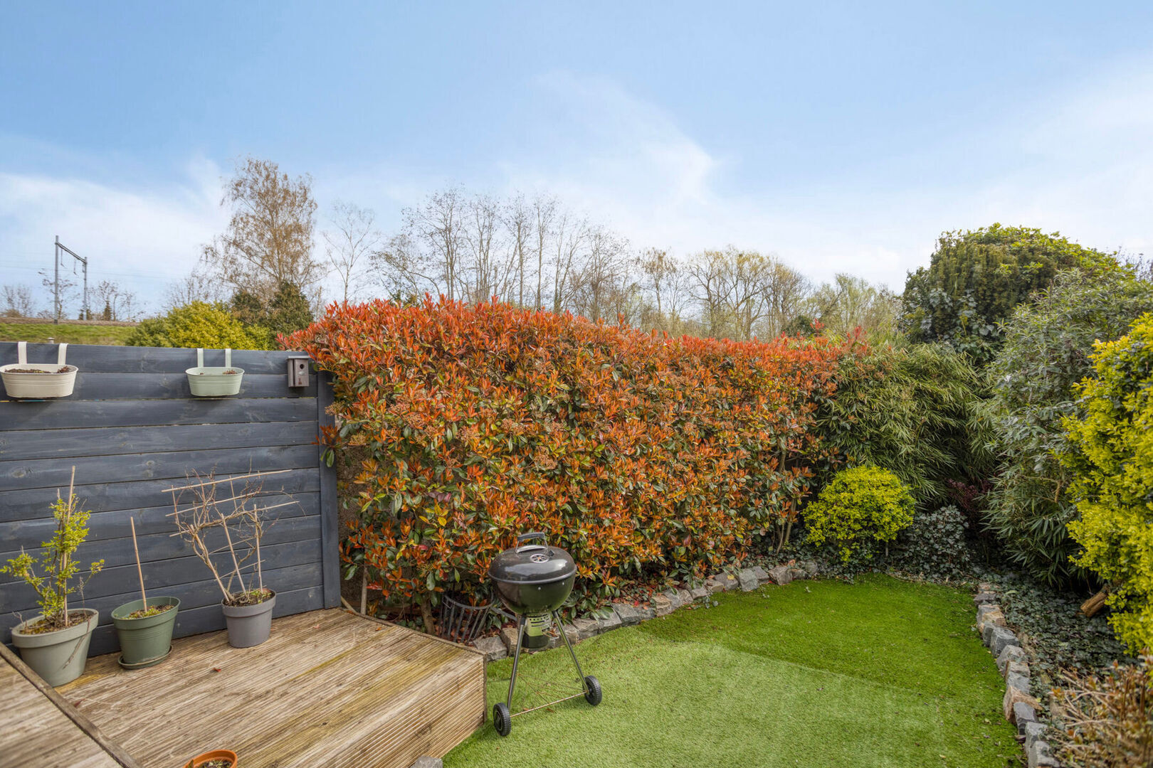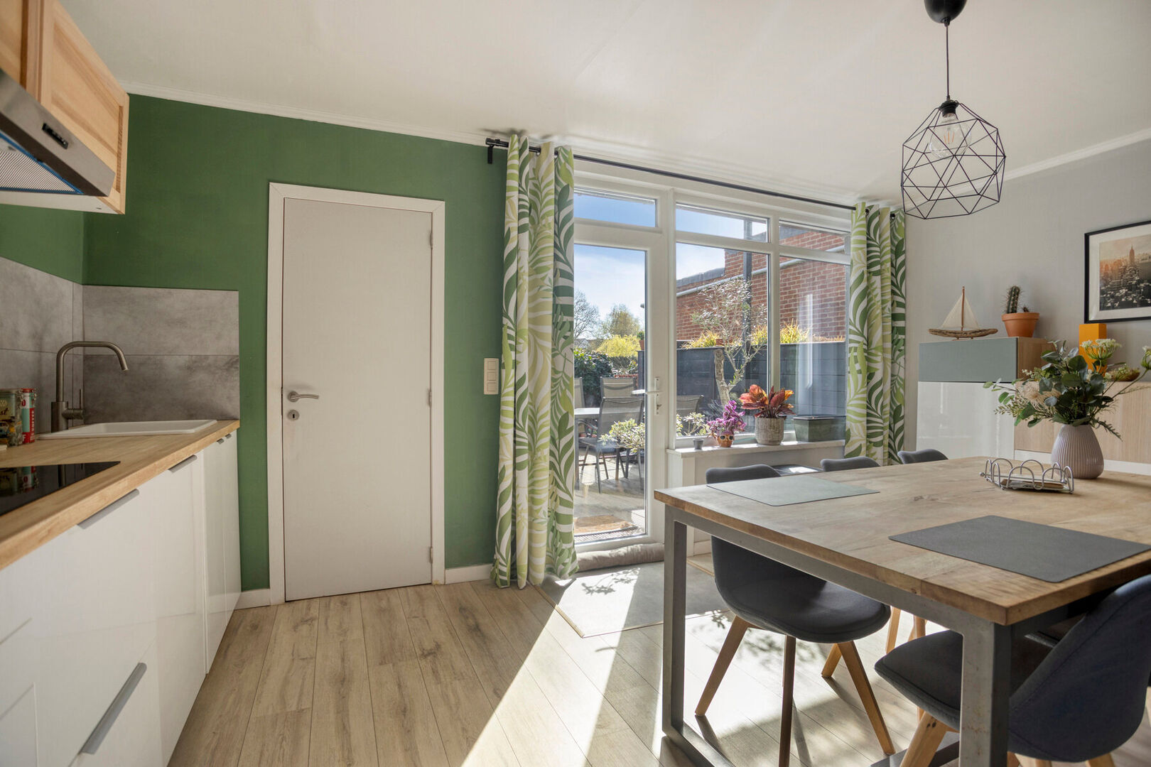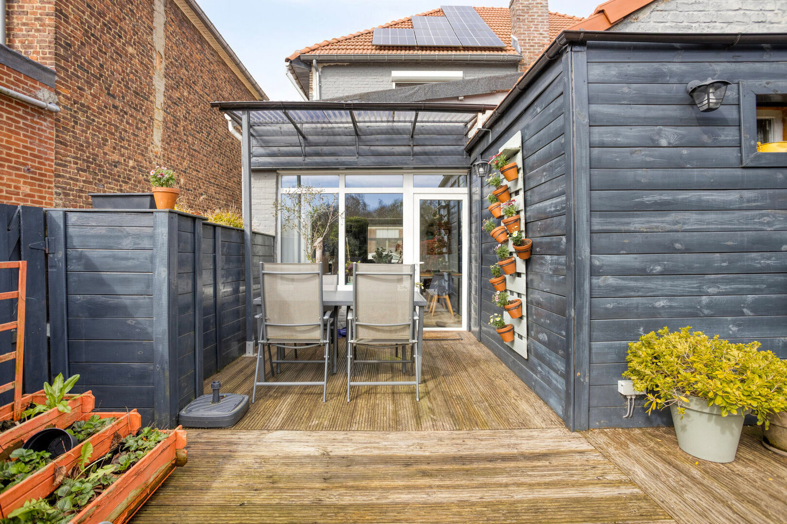 Buiten geniet u van een aangenaam terras en een achterliggende tuin die bereikbaar is via een erfdienstbaarheid, ideaal om in alle rust te ontspannen.