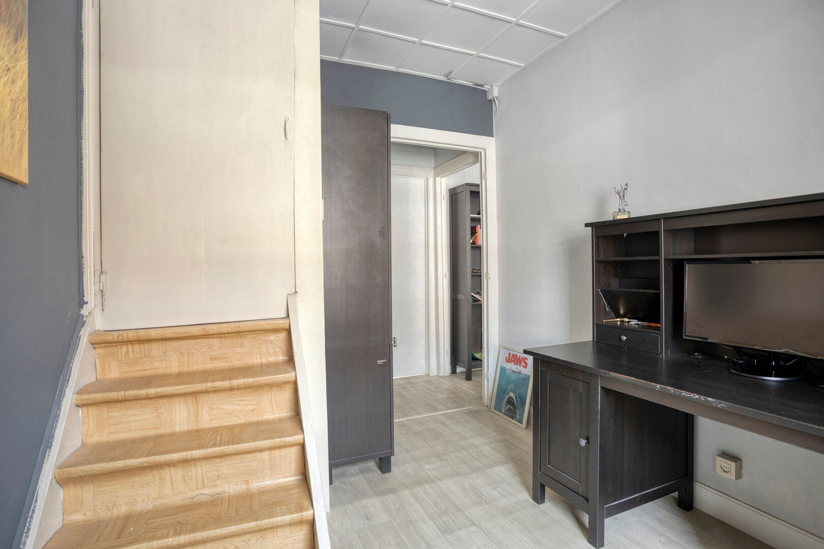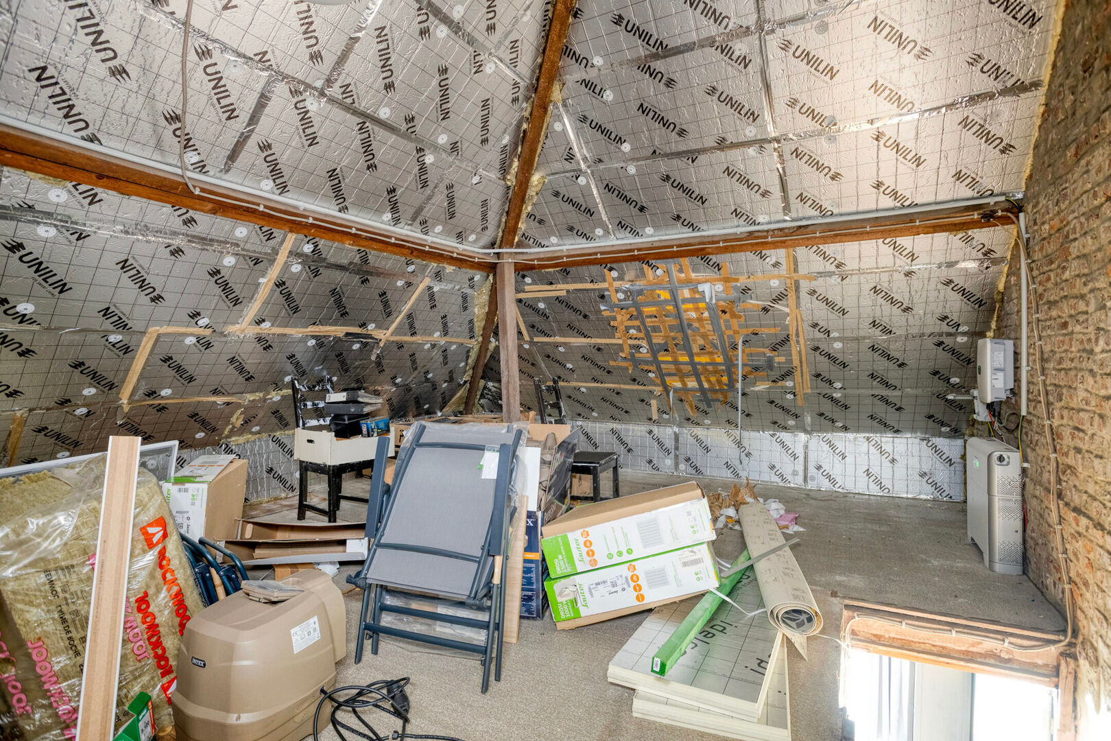 Op de eerste verdieping zijn er drie volwaardige slaapkamers. Vanuit één van de kamers is er via een vaste trap toegang tot de zolder. Deze ruimte is reeds geïsoleerd en biedt tal van mogelijkheden, zoals het creëren van een extra slaapkamer, hobbyruimte of bureau, mits verdere afwerking.