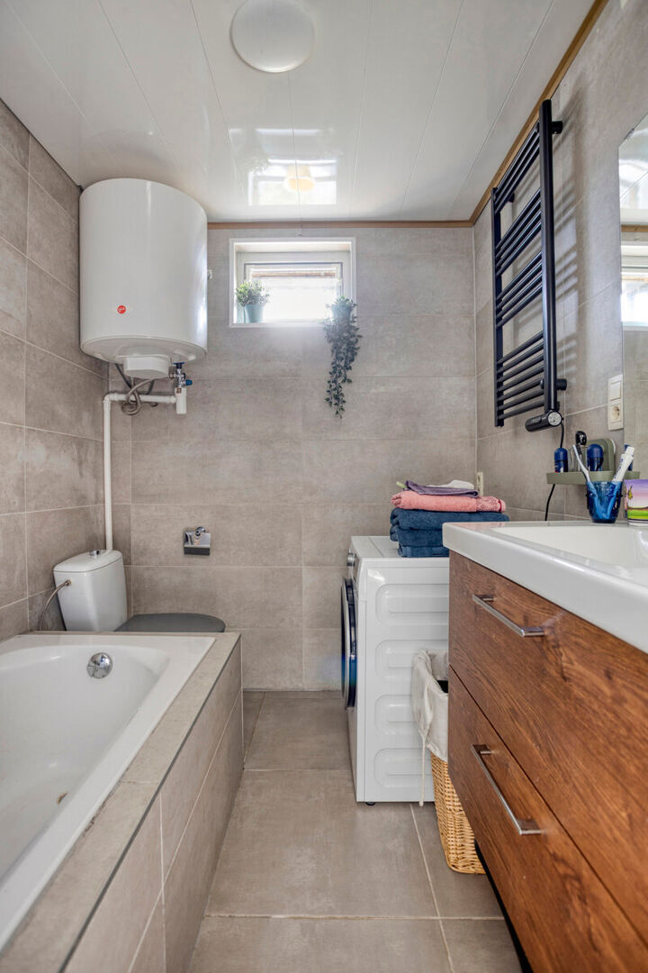 Bij het betreden van de woning komt u in de inkomhal die toegang geeft tot de lichtrijke leefruimte. Deze bestaat uit twee gezellige delen en wordt verwarmd door een efficiënte pelletkachel, wat zorgt voor een warme en uitnodigende sfeer. Aansluitend bevindt zich de vernieuwde keuken, evenals de badkamer die uitgerust is met een ligbad, lavabo en toilet.