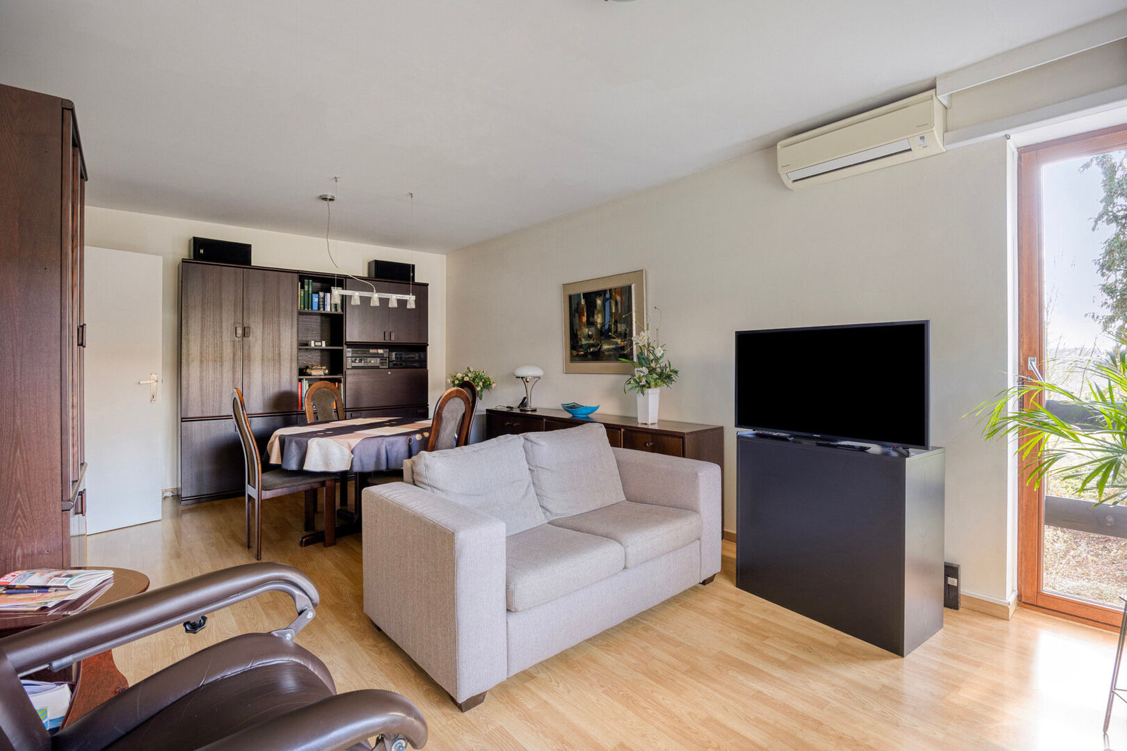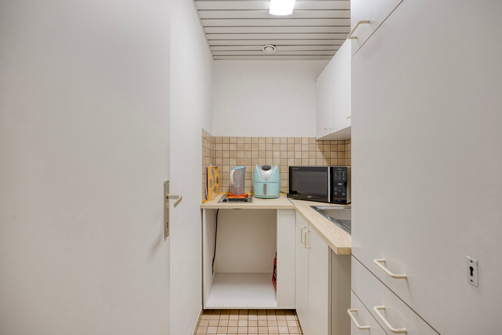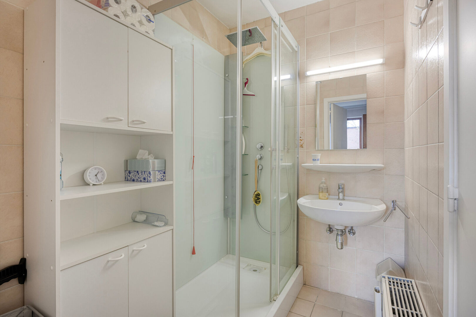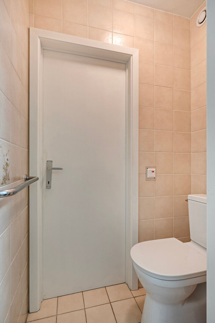 De flat bevindt is bereikbaar zonder trap of lift en omvat een lichtrijke leefruimte met airco en toegang tot een privatief terras, een praktrisch ingerichte keuken, een slaapkamer en een badkamer met douche, lavabomeubel en apart toilet. Vanuit het appartement heb je een open zicht (geen directe overburen). Het appartement is momenteel verhuurd (huuropbrengst ca. €800/maand (excl. kosten). Bij einde van de huur bent u verplicht de badkamer te renoveren.